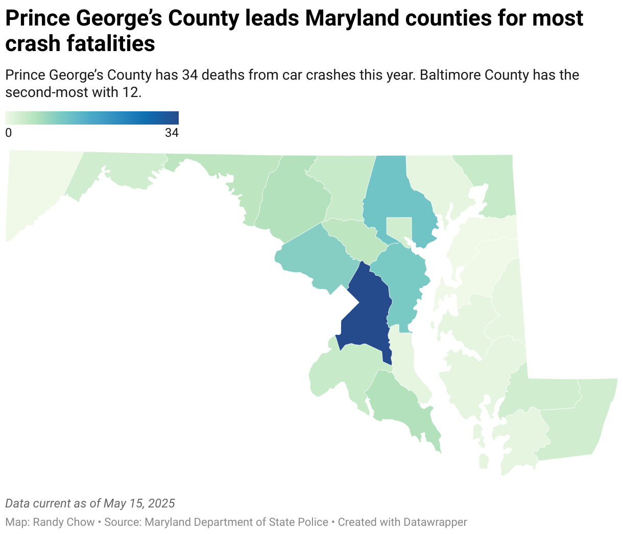 As of Thursday, there had been 34 traffic fatalities this year in Prince George’s County. Baltimore County, which has the next highest total, reported 12. And Montgomery County, which has a population a tenth larger than Prince George’s, reported only 10 crash fatalities this year.