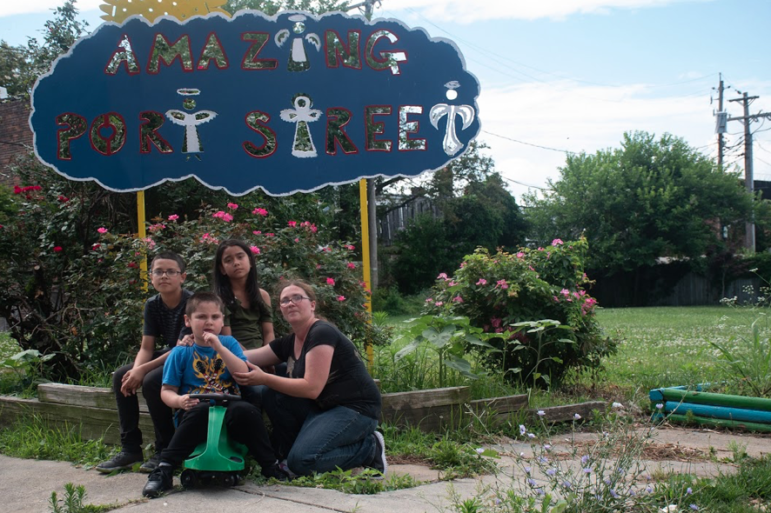 Stephanie Pingley sits outside the Amazing Port Street commons at Amazing Grace Evangelical Lutheran Church in the McElderry Park neighborhood of Baltimore with two of her sons and her niece, right, on June 19, 2019. Her three children all have asthma, which gets worse when heat and humidity are high. University of Maryland Photo/Amina Lampkin