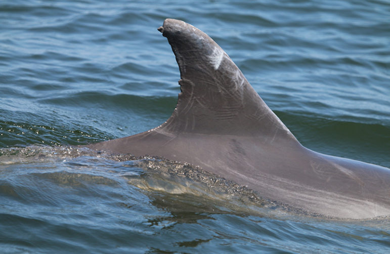Chessie, one of two dolphins named during a contest hosted by the Potomac Conservancy this year, is easily identified by his unique dorsal fin. (Photograph taken under NMFS Permit No. 19403 by Ann-Marie Jacoby)
