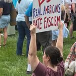 Cars and trucks honked their approval as the crowd waved hand-made signs and American flags as suggested by the national organizers. The signs emphasized support for democracy and opposition to fascism and various policies of the Trump administration. Some used profanity to emphasize their message.