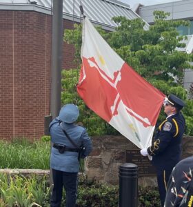 The old Howard County flag is lowered by members of the police and fire honor guard. MarylandReporter.com photo by Len Lazarick