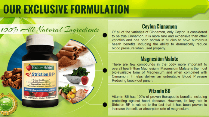 StrictionBP advanced formula is a dietary supplement that supports the overall cardiovascular system through maintaining blood pressure. Ceylon and Cinnamon, the key ingredients in the formulation of StrictionBP, have powerful antioxidant and antihypertensive properties that help maintain healthy blood pressure. This blood pressure supplement is also deemed as one of the best hypertension support by many reviewers.